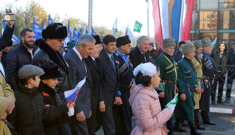 По традиции день народного единства празднуют массовыми шествиями, митингом и праздничным концертом. Жители Ингушетии в едином строю прошли по запланированному маршруту, проявив сплочённость и патриотизм ингушского народа. Всюду можно было увидеть флаги России и Ингушетии, транспаранты с патриотическими лозунгами. Многотысячное шествие началось ровно в 12:00, в котором приняли участие депутаты, руководители органов власти, представители национально-культурных общин, трудовых коллективов, профсоюзов и студенты. В колоннах от муниципальных образований первыми шествовали юнармейцы в красных футболках с логотипом Юнармии. Участники акции, пройдя указанный маршрут до Дворца культуры Назрани, далее приняли участие в митинг-концерте. Здесь же национальные общины, проживающие в Ингушетии представили для участников мероприятия  свои национальные блюда, которые все попробовав оценили по достоинству. Также любой желающий смог принять участие в конкурсе на лучшую выпечку в рамках гастрономического фестиваля «Чапильг-2017» , по итогам которого победителей наградят памятными подарками. Мероприятие сопровождается культурно-развлекательной программой с участием деятелей культуры и искусства Ингушетии и представителей национальных диаспор. Празднование Дня народного единства завершился большим концертом в Доме культуры в Назрани с участием деятели культуры и искусства республики, представители национальных диаспор.