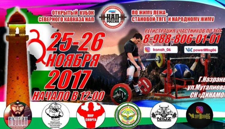 25-26 ноября 2017 года в специализированном клубе «Динамо» в Назрани будет проходить Открытый Кубок Северного Кавказа НАП по жиму лежу, становой тяге и народному жиму. Организаторами турнира выступают Национальная ассоциация пауэрлифтинга, Федерация пауэрлифтинга Республики Ингушетия, спортивный клуб «Къонах» при поддержке регионального Минспорта. Турнир носит характер мастерского и будет проходить в 7 весовых категориях в каждой дисциплине. Предварительно планируется участие 150 спортсменов из различных регионов России, таких как Москва, Нижний Новгород, Санкт-Петербург, Тула и другие, Ингушетию на данных соревнованиях представят порядка 40 пауэрлифтеров.