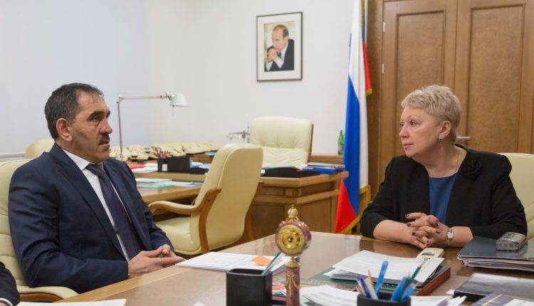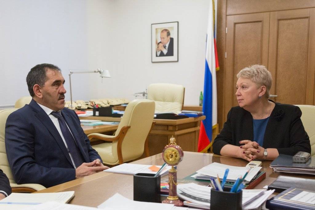 Глава Ингушетии Юнус-Бек Евкуров и Министр образования и науки РФ Ольга Васильева в ходе встречи 7 декабря в Москве обсудили планы по выполнению заявок на строительство объектов образования, поданных регионом в Минобрнауки РФ, а также ввод в строй до конца года двух школ в республике.