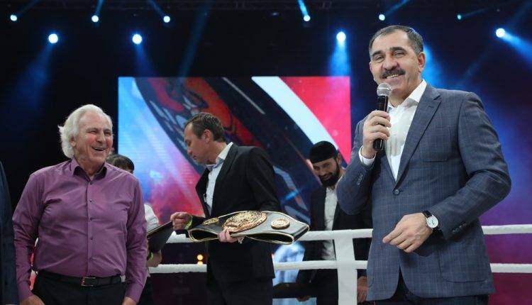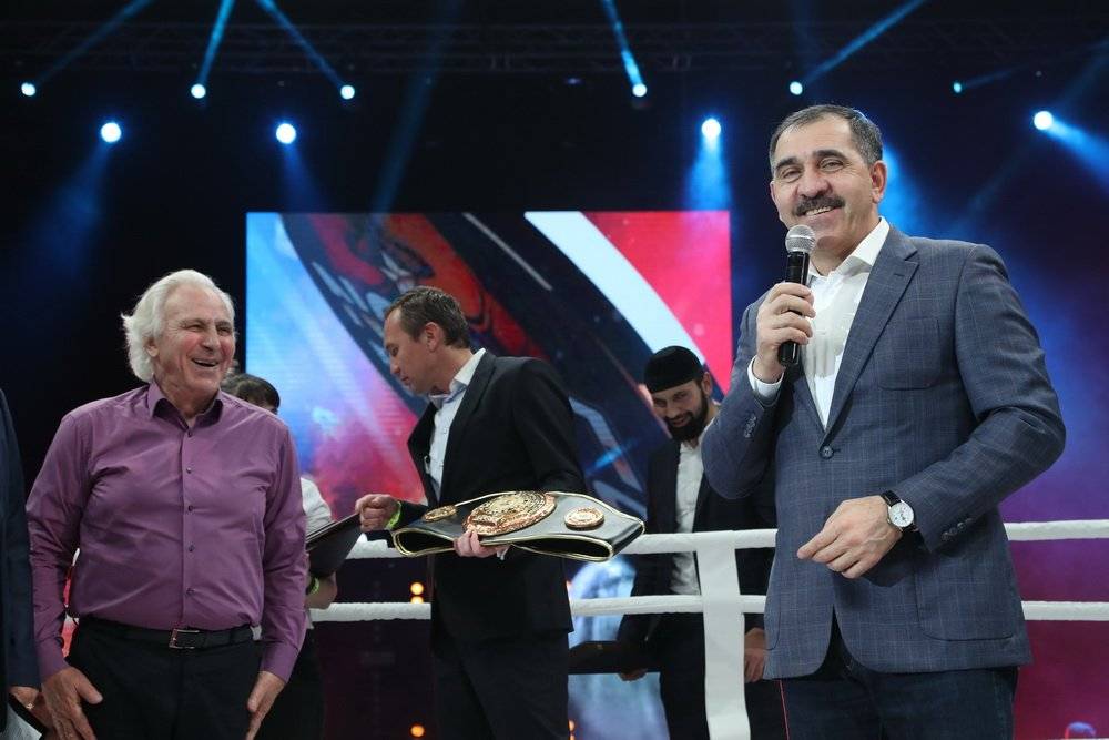 Сергей Костенко от имени ФПБ ЮФО и СКФО преподнес золотой пояс чемпиона Юнус-Беку Евкурову, а также вручил золотые значки ФПБ ЮФО и СКФО  руководителю субъекта, под патронажем которого проводится вечер бокса, и руководителю региональной федерации бокса Хусейну Бузуртанову, который также в знак благодарности за поддержку и внимание к спорту преподнес Главе республики памятный подарок — саблю.
