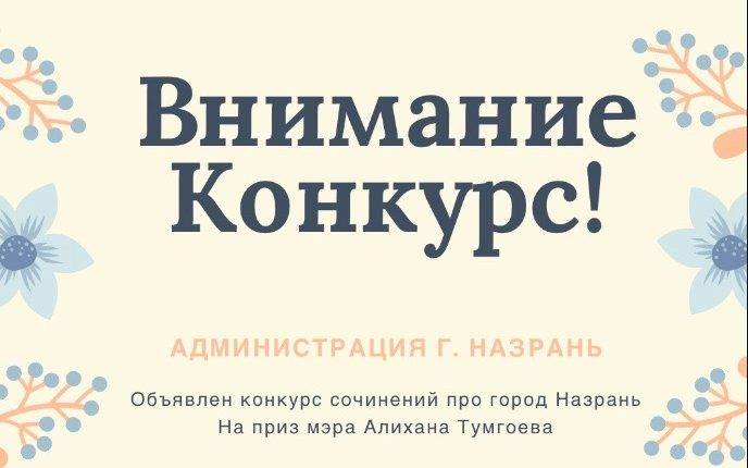 Городская Администрация объявляет конкурс на приз мэра Алихана Тумгоева среди школьников на лучшее сочинение про Назрань. Работы будут оценивать члены жюри, в состав которого войдут представители мэрии, Горсовета Назрани, городской газеты «Голос Назрани» и члены  общественного совета.