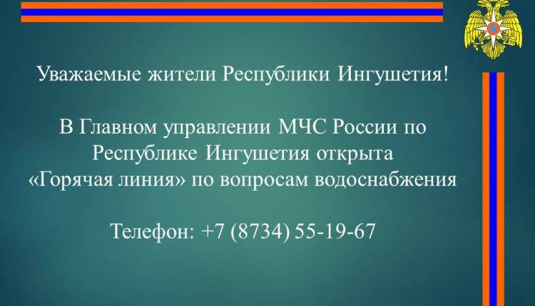 Уважаемые жители Ингушетии. В ГУ МЧС России по РИ открыта «горячая линия» по вопросам водобснабжения тел. 8 (8734) 55-19-67