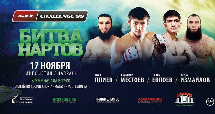 17 ноября в Ингушетии состоялся международный турнир по боевым смешанным единоборствам M1 Challenge 99 «Битва нартов». Во Дворце спорта «Магас» имени Берда Евлоева в Назрани встретились бойцы из России, Бразилии, Финляндии, Украины, Кыргызстана и Грузии. Всего фанаты ММА увидели двенадцать поединков, семь из которых провели представители Ингушетии. В первом противостоянии молодой боец, представляющий БК «Груша» и команду «Сечь PRO», Глеб Хабибуллин одолел ингушского спортсмена, кандидата в мастера спорта по вольной борьбе Амира Бадиева. Однако уже второй бой порадовал ингушских болельщиков — чемпион Европы по панкратиону, любимец публики Лом-Али Нальгиев единогласным решением судей выиграл бой в весовой категории до 73 кг. Ингушскому бойцу противостоял чемпион Кыргызстана по джиу-джитсу, грепплингу и рукопашному бою Турсунбек Асылгазиев. Далее четыре боя ингушских спортсменов закончились не в их пользу. В весовой категории до 84 кг Аслан Измайлов в тяжелом поединке проиграл Владимиру Трусову («Самбо-Питер»). Чемпион СКФО по боевому самбо ингушский боец до этого провел в профессиональных смешанных единоборствах два боя, и оба раза его противники отправлялись в нокаут. В третьем поединке ему не повезло. Также Ахмадхан Боков в весе до 65,8 кг проиграл испанцу Аридану Ромеро. А Вадим Шабадаш из Украины победил Мусу Плиева удушающим приемом в весовой категории до 84 кг. В весе до 61,3 кг не смог победить Александра Осетрова («Новый поток») и Селем Евлоев — брат действующего чемпиона М-1 в легчайшем весе Мовсара Евлоева. Зато не знающий поражений Абубакар Местоев еще раз доказал, что он остается одним из лучших ударников в ММА. Ингушскому бойцу в весе до 65,8 кг противостоял все три раунда бразилец Элиаш Алвеш да Сильва, который выступает на профессиональной арене смешанных единоборств с 18 лет и за семь лет провел 28 боев, в 21 он одержал победу, из них 14 — нокаутом. По этому поводу Глава Ингушетии написал на своей странице в «Инстаграм»: «Поздравляю Абубакара Местоева с уверенной победой в «Битве нартов». Представитель клуба «Нарт» — один из самых талантливых спортсменов организации с отличной ударной техникой. В очередной раз он это доказал в борьбе с соперником Элиаш Алвеш да Сильва из Бразилии. Наш боец вынужден был из-за травмы пропустить почти год, но смог достойно вернуться и продолжить карьеру. С удовольствием посмотрел бой! Спасибо спортсменам за красивый поединок! Уверен, что Абубакар является одним из главных кандидатов на титульный поединок в полулегком весе. Желаю ему новых ярких выступлений и завоевания пояса чемпиона». На турнире «Битва нартов» отличился 20-летний Амиран Гоголадзе из Грузии, который выиграл бой за 10 секунд. В поединке до 77,1 кг он одержал убедительную победу над бойцом из Финляндии Юхо Валамаа. Грузинский боец, обрушив град ударов, отправил соперника в нокаут при мощной поддержке зрителей. Амиран Гоголадзе является чемпионом Грузии по смешанным боевым единоборствам и победителем международных турниров по грепплингу. До этого он провел в рейдже M-1 Challenge три поединка и во всех трех одержал уверенную победу. Четвертая победа подряд открыла ему дорогу к титульному бою. Отметим, что ассистентом Гоголадзе выступил ингушский боец Хамзат Долгиев. Ингушские спортсмены подарили победителю кинжал прямо в рейдже. В главн