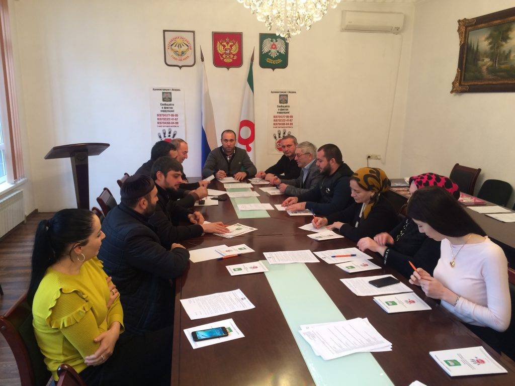 Также согласно плану мероприятий администрацией 6 декабря в г. Назрань состоялся круглый стол на тему «Мы против коррупции» и проведены семинарские занятия с муниципальными служащими администрации города, участие приняли и представители общественного совета. Участники встречи рассмотрели ряд вопросов, в том числе: