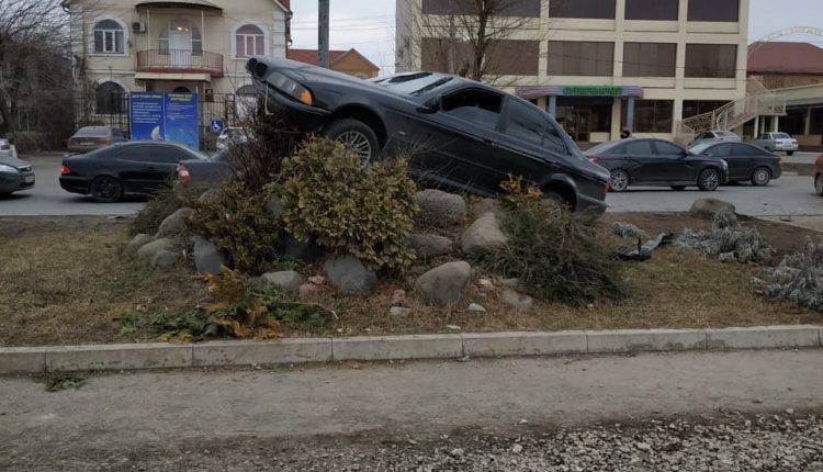 В Назрани иномарка на полном ходу заехала на декоративно оформленную клумбу и повисла на установленных там больших валунах. Автомобильная авария произошла днем в среду на улице Муталиева в Назрани. Автомобиль БМВ столкнулся с «Ладой Калина». После столкновения иномарка на большой скорости вылетела с трассы прямо на клумбу и повисла на валунах в районе перекрестка. На место происшествия выезжал глава округа. По его словам, жертв и пострадавших нет, но обе машины получили значительные повреждения.