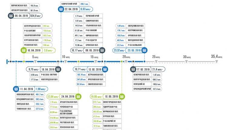 По состоянию на 23 мая 2019 года правлением государственной корпорации рассмотрены заявки и приняты решения о выделении средств 47 субъектам РФ на общую сумму 23,32 млрд. рублей. Финансовые средства будут направлены на переселение 38 198 человек из 16 492 аварийных жилых помещений общей площадью 631,4 тыс.кв.м. на территории 365 муниципальных образований. Информация об объемах финансирования по принятым решениям наглядно представлена в инфографике, разработанной Фондом ЖКХ.