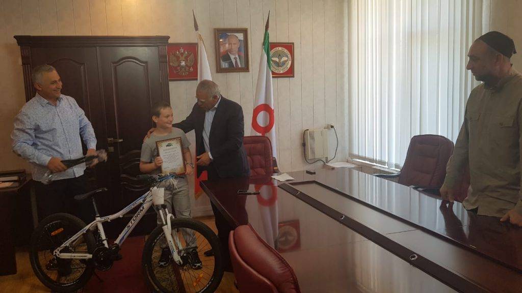 Сегодня он вместе со своим отцом Абубакаром Мациевым побывал в гостях у мэра Назрани Алихана Тумгоева. Глава города поблагодарил мальчика за поступок, героизм, вручил ему Благодарность и подарил велосипед.