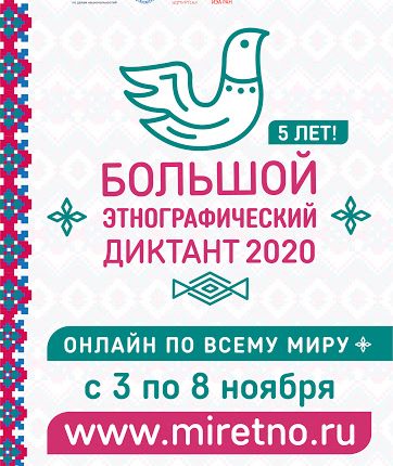 3 ноября 2020 года (по мск) на официальном сайте Большого этнографического диктанта www.miretno.ru. Задания оформлены в виде теста и включают в себя: — 20 вопросов – общефедеральная часть, единая для всех участников; — 10 вопросов – региональная часть, уникальная для каждого субъекта Российской Федерации. Максимальная сумма баллов за выполнение всех заданий – 100. Время прохождения диктанта – 45 минут. По истечении данного времени доступ к заданиям будет закрыт.