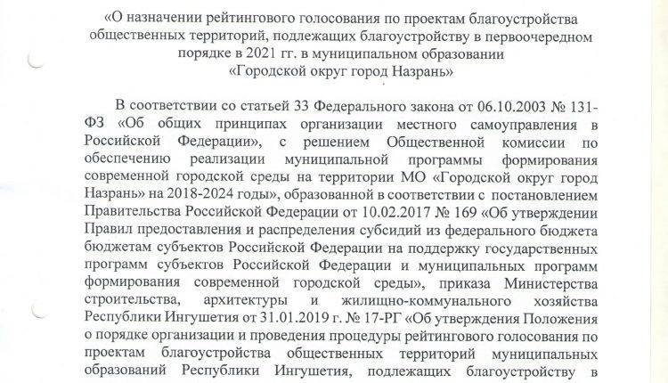 Городская среда ПОСТАНОВЛЕНИЕ №518 от 12.11.2020г. «О назначении рейтингового голосования по проектам благоустройства общественных территорий, подлежащих благоустройству в первоочередном порядке в 2021 гг. в муниципальном образовании «Городской округ город Назрань» От redactor Последнее Обновление Янв 12, 2021 0 632 Поделиться 5. Постановление №518 от 12.11.2020 О назначении рейтингового голосования на 2021 гг 0 632 Поделиться WhatsAppЭл. адресTelegramVKPrint