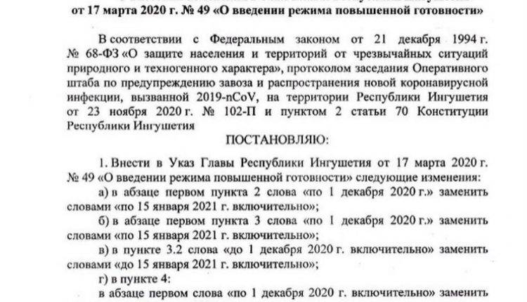 Новости Указ Главы Республики Ингушетия «О введении режима повышенной готовности» От redactor Последнее Обновление Дек 1, 2020 0 1 138 Поделиться 0 1 138 Поделиться WhatsAppЭл. адресTelegramVKPrint
