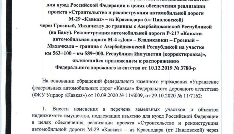 Распоряжение от 11.12.2020г. О внесении изменений ы перечень земельных участков и объектов недвижимого имужества, подлежащих изъятию для нужд Российской Федерации в целях обеспечения реализации проекта «Строительство и реконструкция автомобильной дороги М-29 «Кавказ».