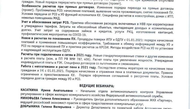 Новости Всероссийский практический вебинар «Порядок расчета и прием платежей за коммунальные услуги и ресурсы в 2021 году» От redactor Последнее Обновление Фев 1, 2021 0 837 Поделиться 0 837 Поделиться WhatsAppЭл. адресTelegramVKPrint