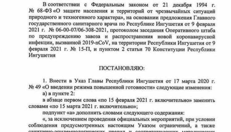 Новости Указ Главы РИ Калиматова М.М. О внесении изменений в Указ Главы Республики Ингушетия от 17 марта 2020г. №49 «О введении режима повышенной готовности» От redactor Последнее Обновление Фев 12, 2021 0 1 108 Поделиться 0 1 108 Поделиться WhatsAppЭл. адресTelegramVKPrint