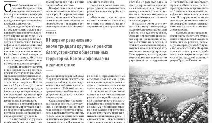 Издание Правительства Российской Федерации «Российская газета» опубликовало большую статью, посвященную городу Назрани, отметив успешную реализацию муниципалитетом национальных проектов и работу по изъятию незаконно оформленных земель.