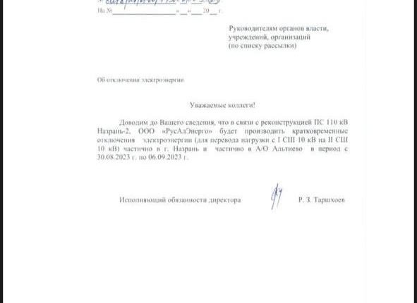 Доводим до Вашего сведения, что с 04.09.2023 по 06.09.23г. ежедневно с 9:00 до 18:00 будет производиться отключение электроэнергии частично в г. Назрань, частично в А/О Альтиево (преимущественно, район «Юбилейный», район за каналом) в связи с проводимыми работами ООО «РусАлЭнерго».