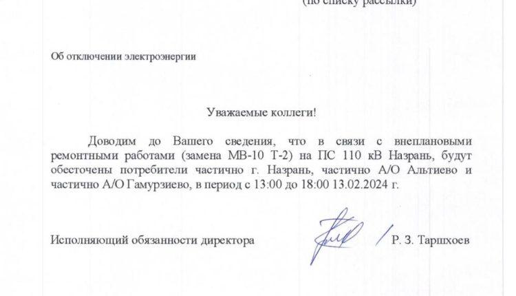 Завтра, 13 февраля 2024 г., с 13:00 до 18:00 планируется отключение электроэнергии частично в Центральном, Альтиевском и Гамурзиевском округах Назрани.