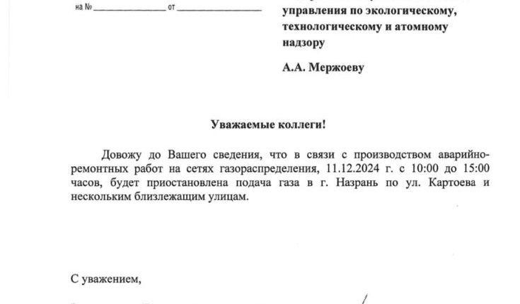 📢В связи с проведением аварийно-ремонтных работ на сетях газораспределения с 11.12.2024 с 10:00 до 15:00 будет приостановлена подача газа в г. Назрань по ул. Картоева и несколько близлежащим улицам.