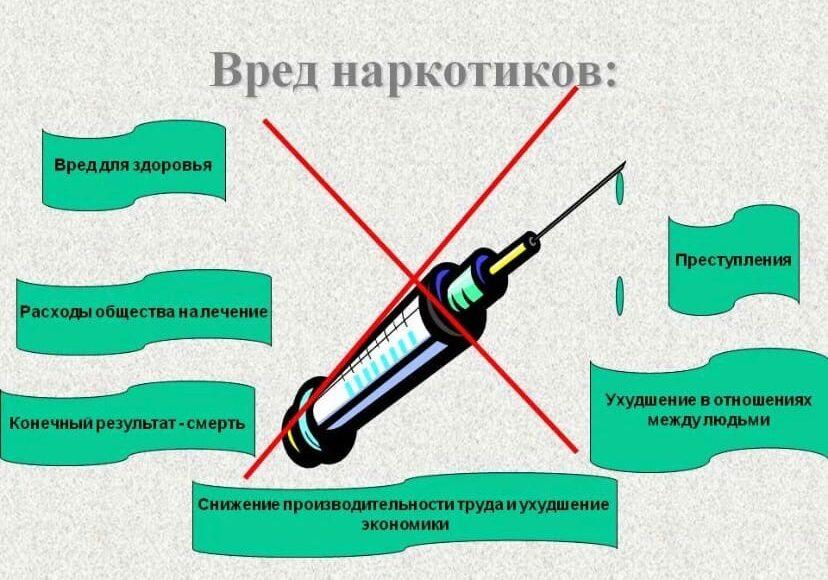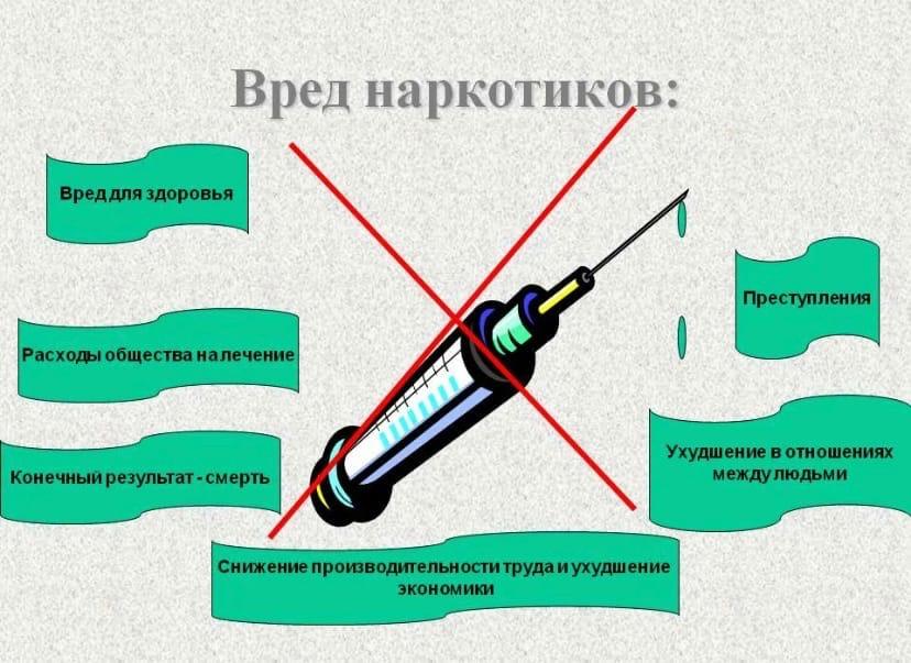 Абсолютно все наркотики по своей природе являются ядами, поражающими все системы органов и тканей, но особенно центральную нервную систему, мозг, половую систему, печень и почки. Как правило, люди с самым крепким здоровьем при регулярном употреблении наркотиков живут не более десяти лет. Большинство умирает раньше. Весьма распространены случаи, когда люди, умирают в течение первого года с момента начала употребления наркотиков. 95% наркоманов, употребляющих наркотики инъекционным путем заражены ВИЧ-инфекцией, гепатитом В и С, сифилисом и т.д. От этих болезней они часто умирают раньше, чем самих наркотиков.